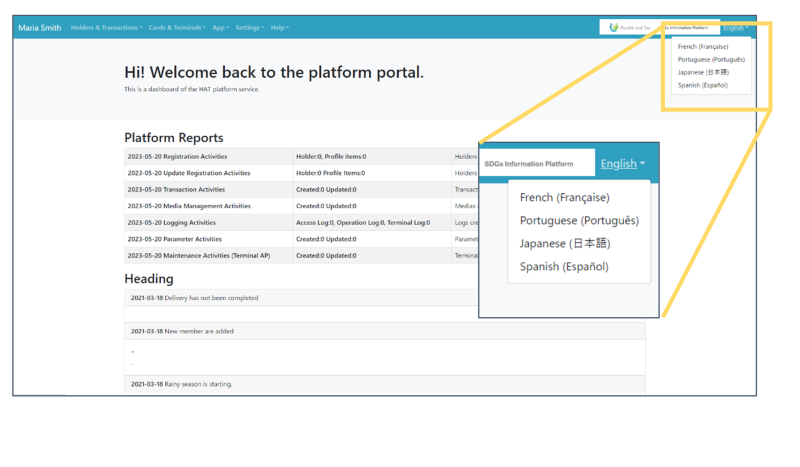 The portal's display language can be changed to English, Japanese, French, Portuguese, or Spanish by clicking the language switch button in the upper right corner of the portal.