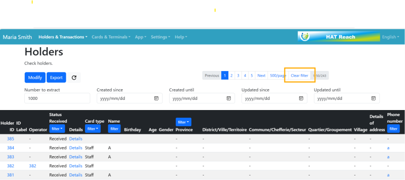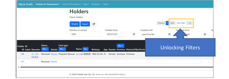 If you open the Holder in Tab 2 separately from the page opened in Tab 1 and use the filter criteria, the Holder information filtered in Tab 2 will also appear in Tab 1. To clear the filter, please click the” Clear filter“ button as below. Note that clearing or unlocking the filter will affect all open tabs.