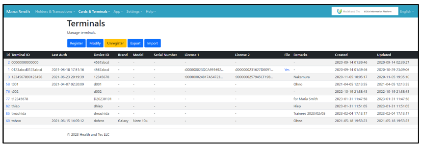 Terminals are managed in the “Terminals” menu. If you need to create an inventory in this system, please use the “Brand”, “Model”, and “Serial Number” fields of each terminal. It is recommended to use the “Remarks” field for the name of the terminal owner. The “Last Auth” field indicates how often the terminal is connected to the Internet.
