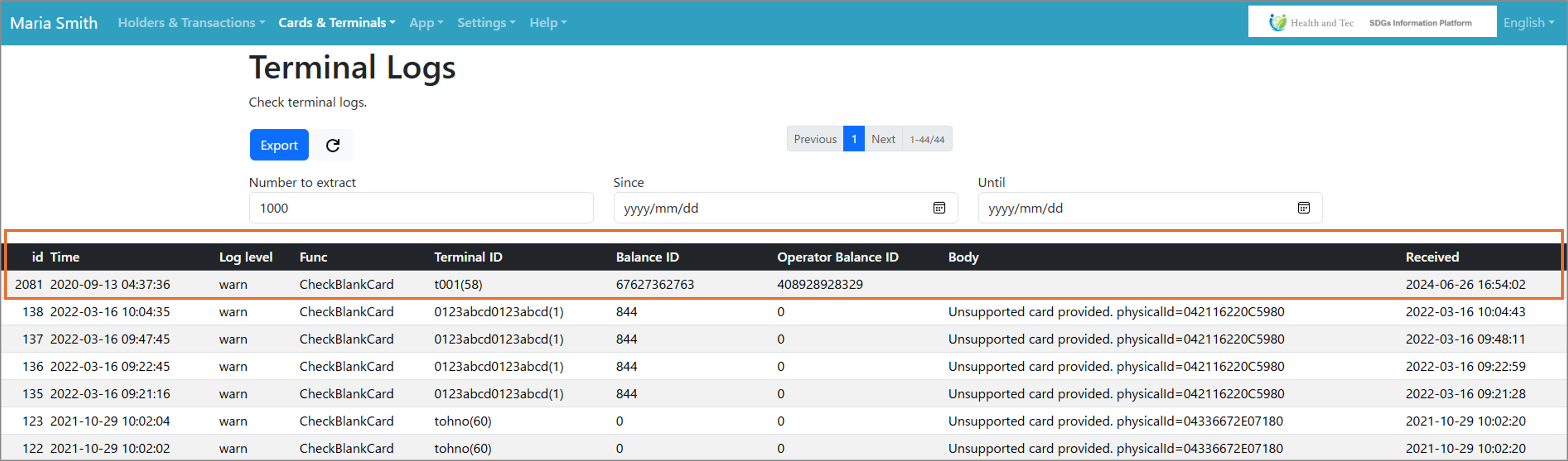| Received | Date and time when the transaction log is made at the terminal is received by the server |